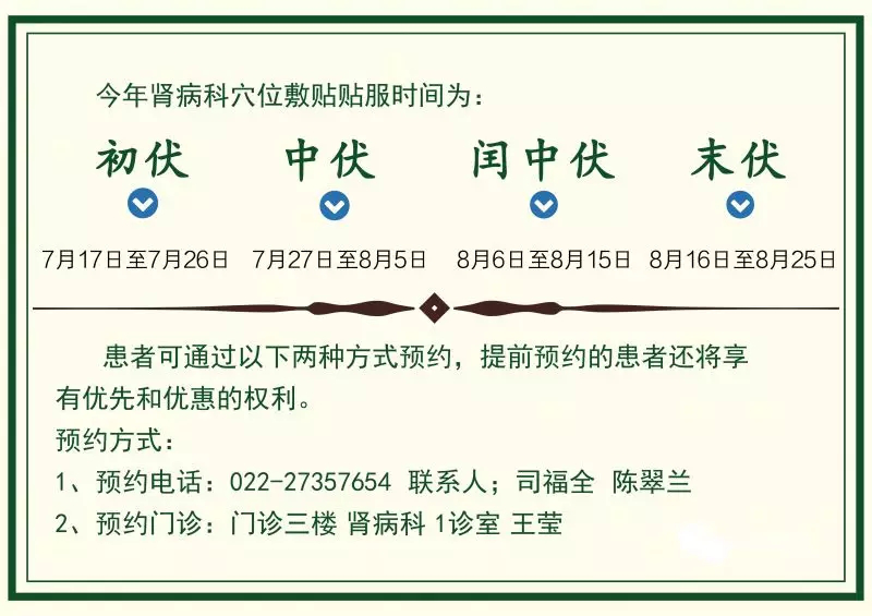 冬病夏治”是我国传统的中医药特色疗法。“冬病夏治三伏贴”属于中医传统外治法之一,根据“春夏养阳,秋冬养阴”的原则,使人体之阳气得天阳之助和药物阳气的疏通,达到温阳利气,驱逐内伏寒邪,增人体阳气和免疫力,达到治病和养生的目的。入夏伊始,记者从天津市中医药研究院附属医院获悉,该院将在三伏期间开展肾病科的穴位敷贴治疗,并已开始全面预约。 市中研附院肾病科徐英主任介绍说,由于慢性肾脏疾病患者多存在肾气不足,特别是阳气不足,且常因外感、劳累等因素致病情反复或加重。 肾病穴位敷贴治疗 夏季是人体阳气最为旺盛的时节,此时通过穴位贴敷治疗调节机体阴阳平衡,可达到事半功倍的效果。 肾病的穴位敷贴治疗是利用夏季阳气旺盛(人体阳气达到四季高峰),尤其是三伏天,肌肤腠理开泄。选取穴位敷贴,药物最容易由皮肤渗入穴位经络,能通过经络气血直达病处。所以在夏季治疗冬病,往往可以达到最好的效果。在伏天进行穴位贴药,可通过经络内传,气候、穴位、药物三者共同作用,鼓舞正气,增强抗病能力,达到防病、治病的目的。 中医谈肾病 中医认为慢性肾脏疾病发生的关键是肾虚,其病因病机为本虚标实,虚实夹杂。肾虚血瘀是其主要病机,湿热、瘀血、浊毒是贯穿始终的病理因素。采用内服外敷的方法治疗肾病效果最好。 由于穴位贴敷法使药物经皮吸收,与口服药物相比,减少药物对胃肠道刺激;同时,不经肝肾代谢,减少肝肾损伤。 三伏贴适应人群 徐主任说,三伏天里应用肾病穴位敷贴对增强体质,提高人体抗病力,具有良好的效果,适用于各种慢性肾病的治疗和预防。 主要适应人群包括: 一、慢性肾脏病:慢性肾炎、肾病综合征、慢性肾衰、糖尿病肾病、高血压肾病、狼疮性肾炎等; 二、易患感冒或虚寒体质,免疫力低下的人群; 三、亚健康状态和肾虚综合征。 敷贴时间 ![]() |