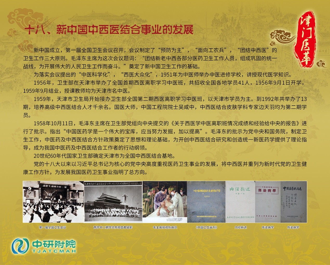 中国中西医结合皮肤学科史展览 金秋时节,正当举国上下一片欢腾,全国人民共同庆祝中华人民共和国成立70周年的幸福时刻,我们迎来了天津市中医药研究院资源重组十周年,第22届全国中西医结合皮肤学科四强联合体年会在津召开。为配合四强联合体年会的召开,“津门医粹”全国中医药文化宣传教育基地举办此次中国中西医结合皮肤学科史展览。 70年风起云涌,70年沧桑巨变,70年的历史画卷,记录了党中央领导卫生健康事业创造的一个又ー个煌成就,见证了广大卫生健康工作者为改善我国卫生面貌,提高人民健康水平作出的重要贡献。 新中国成立,第一届全国卫生会议召开,会议制定了“预防为主”、“面向工农兵”,“团结中西医的卫生工作三大原则,毛泽东主席为这次会议题词:“团结新老中西各部分医药卫生工作人员,组成巩固的统一战线,为开展伟大的人民卫生工作而奋斗”。奠定了新中国卫生工作基础。 1958年10月11日,毛泽东主席在卫生部党组向中央提交的《关于西医学中医离职班情况成绩和经验给中央的报告》进行了批示。指出“中国医药学是一个伟大的宝库,应当努力发掘,加以提高”。毛泽东的批示为党中央和国务院,制定卫生工作,中医药及中西医结合方针政策奠定了思想和理论基础,为开展中西医结合研究和创造统一新医药学提供了理论指导,成为我国中医药及中西医结合工作者的行动纲领。 在党中央、国务院的方针政策指引下,武汉市第一医院、杭州市第三人民医院、天津市中医药研究院附属医院(长征医院)、沈阳市第七人民医院,在坚持发展中西医结合的道路上打破区域界限,寻求优势互补,开启中西医结合发展史上的新篇章,组成国内第一个由同一专业领域的著名专科跨区域的合作联合体。22年来四强联合体,风雨同舟,互助互学,取长补短,在不同的区域,不同的专科学术研究领域都取得了很大的发展,四家单位皮肤科均已成为卫生部国家临床重点专科,在当地颇有影响,深受广大患者欢迎的专业学科。四强联合体为我国中西医结合事业的发展做出的特殊贡献将永载史册。 党的十八大以来我国医药卫生事业迎来“天时地利人和”的时代东风。以习近平总书记为核心的党中央继承和发扬我党高度重视中医药的优良传统,将“中西医并重”、中西医结合”工作列为新时代党的卫生健康工作方针,为发展我国医药卫生事业指明了总方向。 坚持中西医并重,促进中西医学优势互补,融合发展,是我国卫生与健康事业的显著优势。中西医汇聚融合成为现代医学体系应对全球健康挑战的必然选择,认真学习、深刻领会、贯彻执行习近平总书记新时代中国特色社会主义思想和关于发展中医药的重要论述,传承精华、守正创新,坚持中西医并重,中西医合力铸就中国的医学优势,造福全中国、造福全世界。 走进伟大的新时代,展望美好的新未来,蓄势待发的四强联合体,已站在新的、更高的历史起点上,奋力书写新篇章!